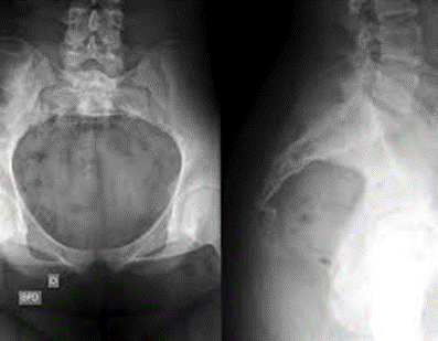 Radiografía de sacro-cóccix: En proyección lateral (derecha) se visualiza fractura-luxación de cóccix, con desplazamiento ventral. La lesión no se visualiza en proyección anteroposterior (izquierda).