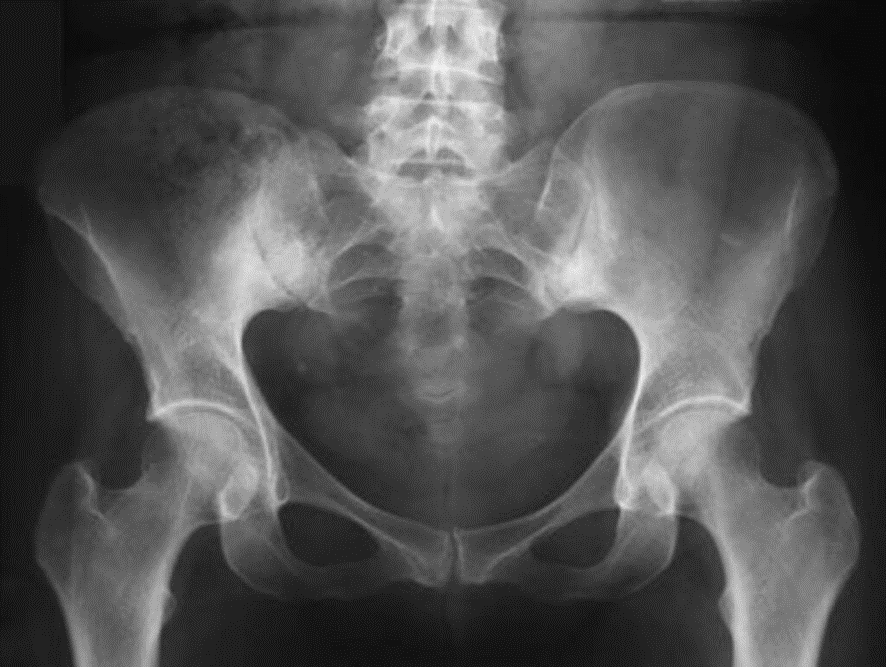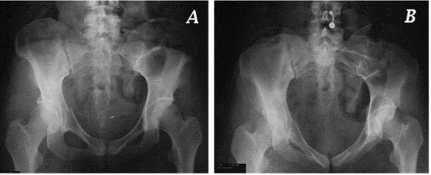 A y B) Radiografía anteroposterior de una mujer que tuvo una fractura de pelvis derecha por compresión lateral. Se puede observar la fractura de las ramas derechas y el desplazamiento en rotación interna de la hemipelvis derecha