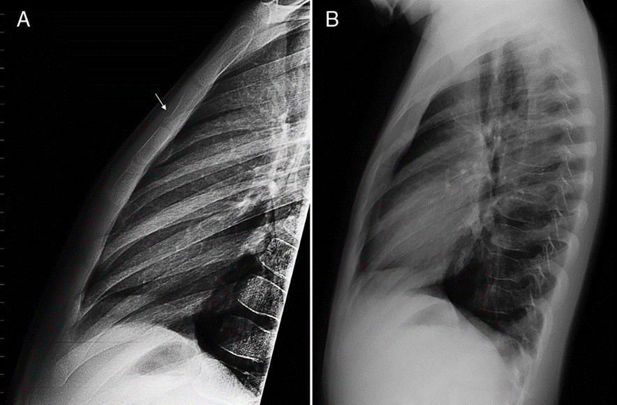 Radiografía lateral de esternón: imagen de fractura de la cortical anterior del tercio superior del cuerpo esternal (flecha). B) Rodiografía lateral de tórax del mismo paciente, donde no se observa ninguna línea de fractura.