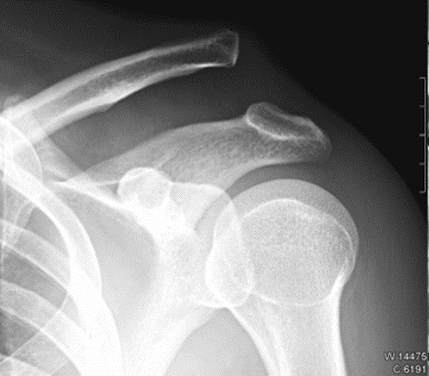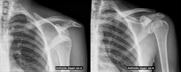 Alteración de la anatomía normal de la articulación glenohumeral izquierda, con desplazamiento anteromedial e inferior de la cabeza humeral fuera de la fosa glenoidea, en localización subcoracoidea. No se observan fracturas ni otros hallazgos asociados. Rx [derecha] después de maniobra de recolocación.