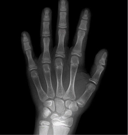 En la radiografía de la mano izquierda, se puede observar engrosamiento de las fisis de las falanges, falanges medias cortas y anormalidades en la morfología de todas las falanges.