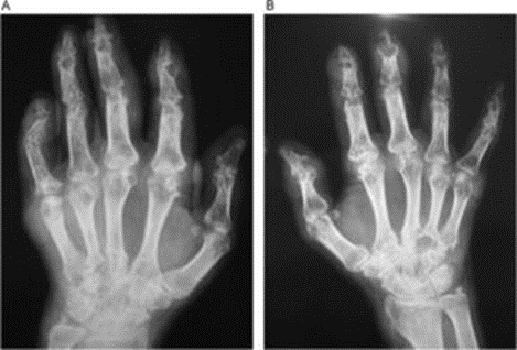 Rx con aumento de partes blandas y erosiones de mano derecha (A) y mano izquierda (B).