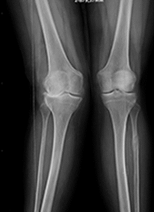 Es una deformidad de las rodillas que provoca que se junten las piernas. Por tanto las personas que la padecen no pueden acercar los tobillos porque sus rodillas chocan entre sí, tal y como se aprecia en la siguiente radiografía que corresponde a un caso severo.